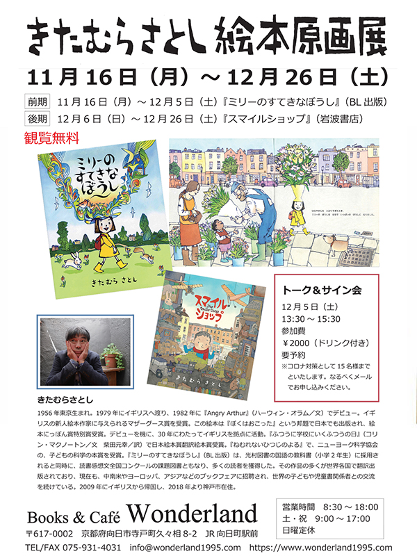 Books & Cafe Wonderlandのギャラリーは、絵本原画や写真、アート作品が持つ“ふしぎ”や“ときめき”に出会える小さな展示室です。